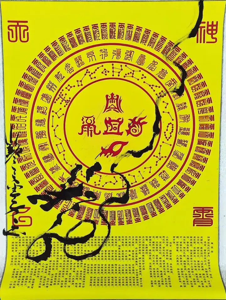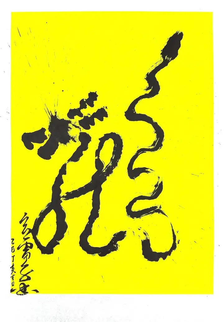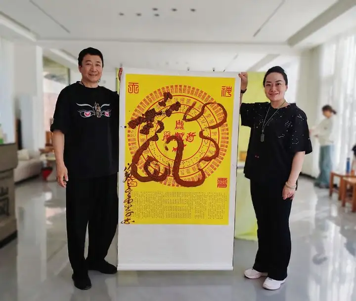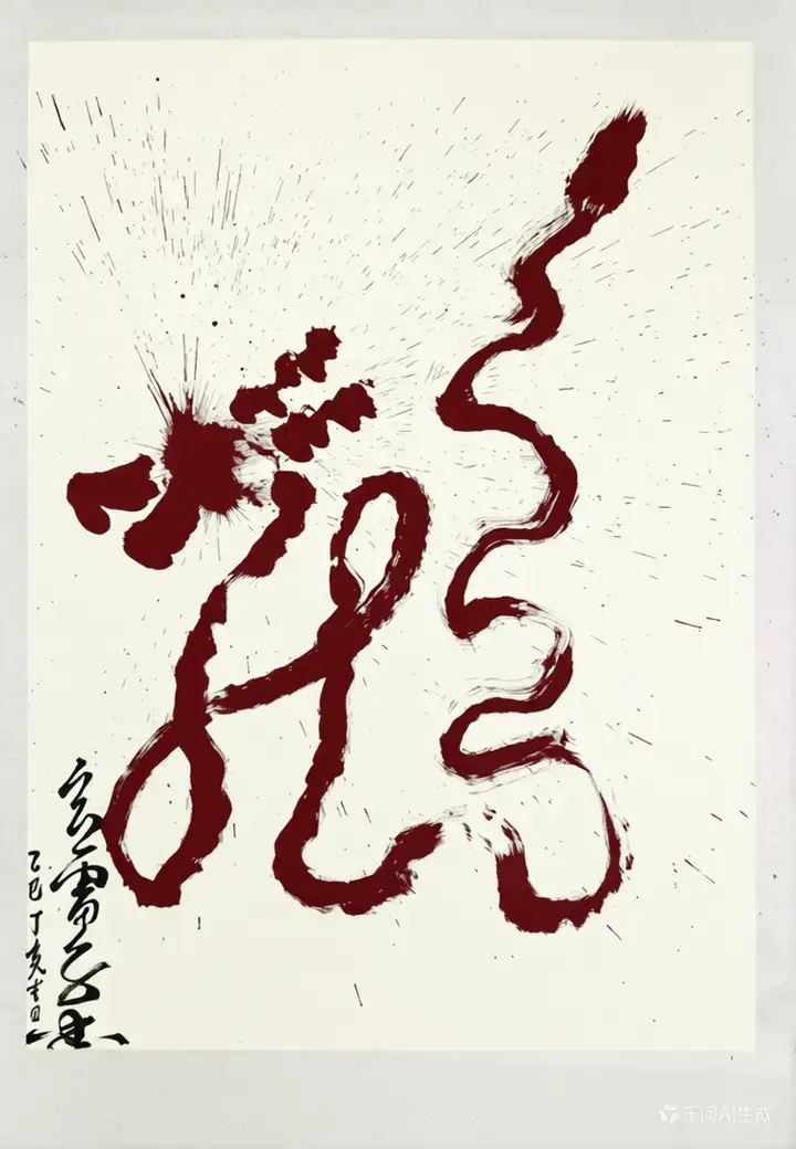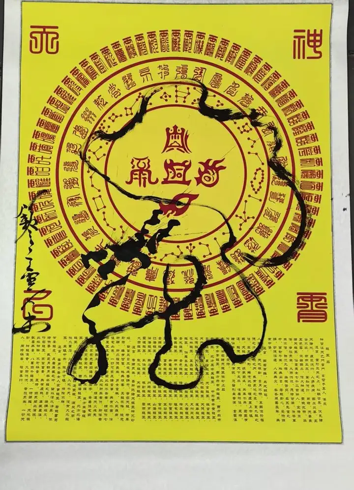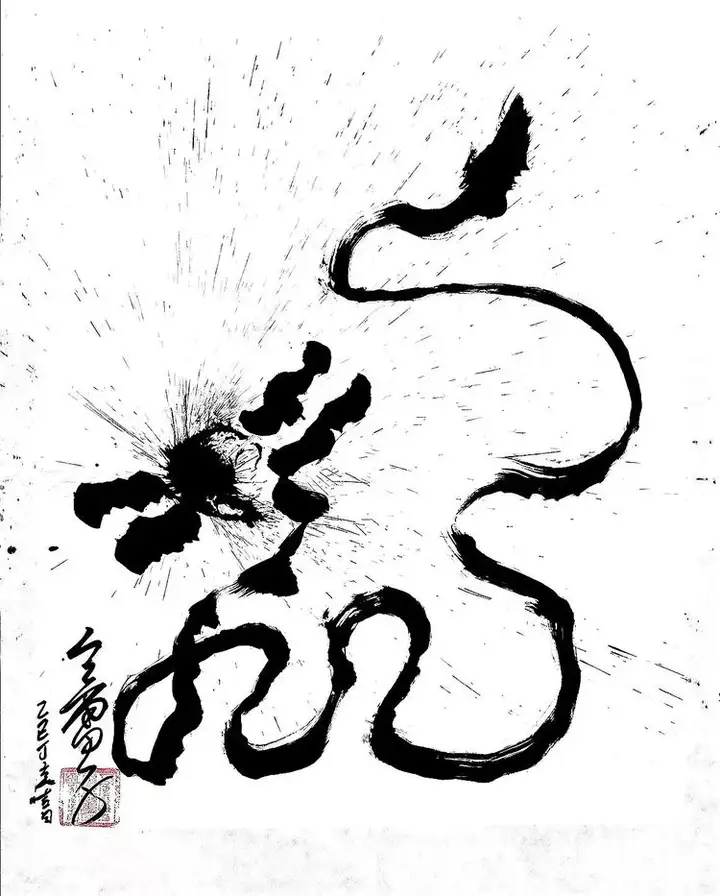 作者凝神运笔之际,呼吸与水墨同频,手腕共心意流转。墨泼纸响,似撼龙初醒;笔走线狂,如真神破空。上引九天清炁注于笔锋,下摄八荒地脉凝于墨韵,挥毫间即是行道,泼洒处开启玄机。观者不仅得见龙形,更可感应龙魂;不仅能赏笔墨,亦能窥见天心。此幅龙图,正是其“医道济世,书画明心”理念的直观彰显——于笔墨呼吸间完成一场天人合一的能量书写,在尺素方寸中构筑一处气韵周流的时空道场。