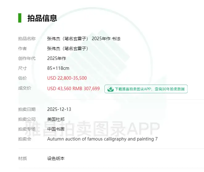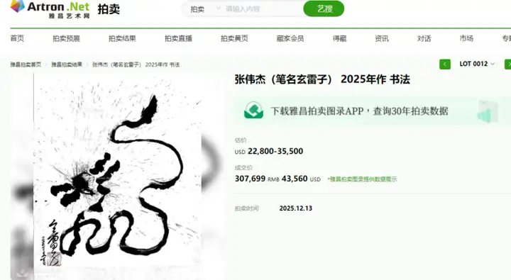 2025年12月13日,美国纽约——在杜邦拍卖公司备受瞩目的“冬季中国书画珍品”拍卖专场中,一幅凝聚浩然之气的水墨意象杰作《一炁龙吟·天地枢》引发激烈竞逐,经过多轮竞价,最终以43,560美元(约合人民币307,699元) 成功落槌,远超市前估价。