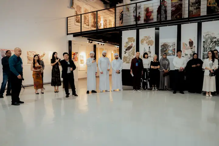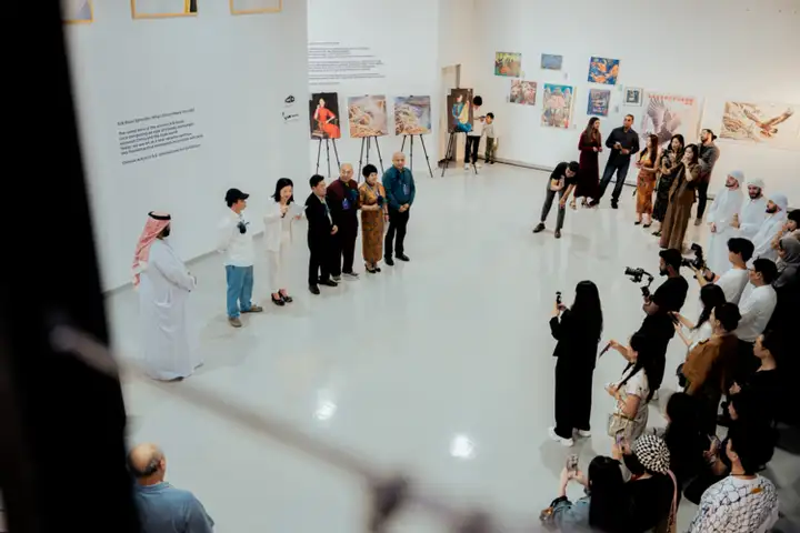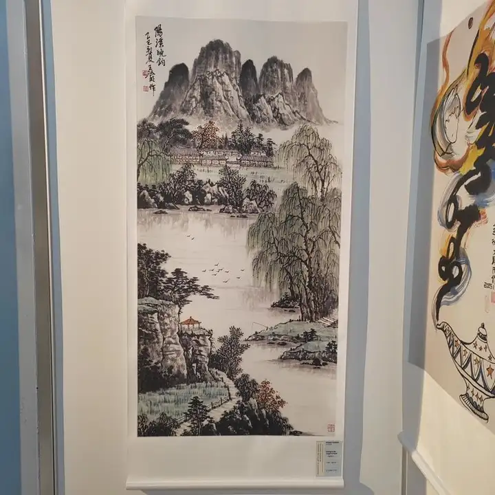 王法明国画作品《阳溪晚钓》亮相阿联酋国际艺术大展的珍贵瞬间,水墨山水形成鲜明视觉对比,将东方田园意趣与中东文化风情的交融展现得淋漓尽致。
