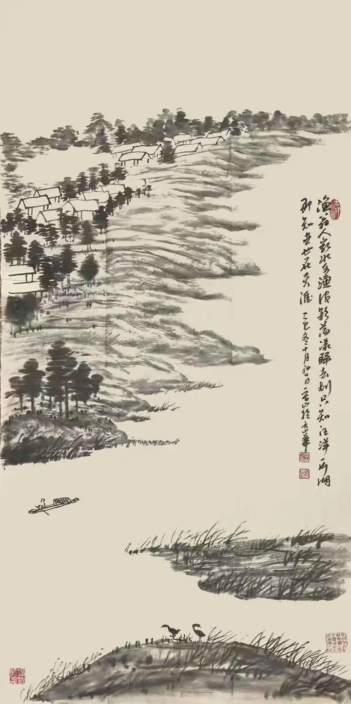 右侧题款的书法与画面相得益彰,笔墨的枯湿浓淡与山水的韵律呼应,诗、书、画、印的融合,延续了中国传统文人画的审美意趣。画中无艳色堆砌,仅以水墨写就,却将渔翁归棹、水乡闲居的悠然意境刻画得淋漓尽致,既守住了传统山水画“澄怀味象”的精神内核,又以现代的笔墨语言赋予了江南水乡新的艺术生命力。这份对乡土的温情描摹,让作品超越了单纯的景致再现,成为画家内心乡愁与人文情怀的载体,观之令人心生宁静,仿佛置身于那片烟波浩渺的江南水乡,体味着自然与人文交融的诗意。
