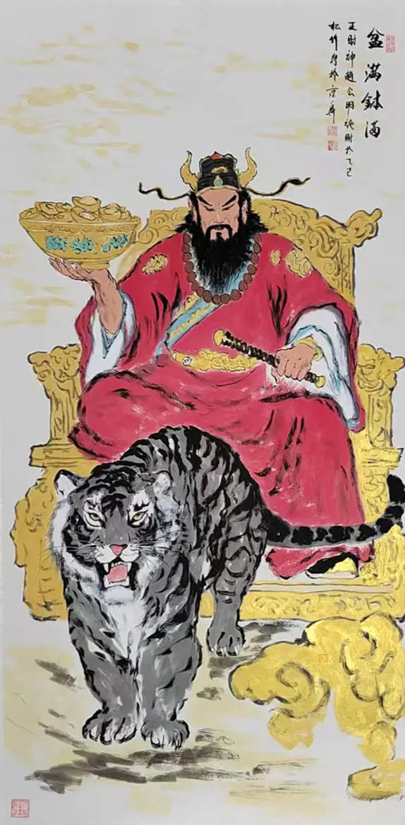 画面中,赵公明红袍金饰端坐宝座,面容威肃却含祥意,左手托聚宝金钵,右手执钢鞭,武将的刚劲与财神的福瑞浑然相融;胯下黑虎体态雄健,墨色浓淡间尽显皮毛的质感与猛兽的威仪,与人物的庄正形成刚柔相济的视觉张力。背景以淡金晕染祥云,既呼应“金满钵满”的主题,又为画面铺就华贵祥和的基调,黄与红的配色更是暗合中式招财纳福的文化意涵。