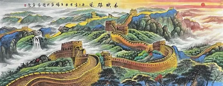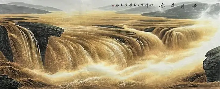 以斧劈皴重构黄河波涛,金粉勾写日出之光,象征民族精神的奔涌不息。