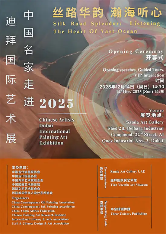 2025年12月14日,“丝路华韵,瀚海听心”中国名家走进迪拜国际艺术展在迪拜SAMIA艺术画廊盛大开幕。此次展览由中国当代油画家协会、中国当代国画家协会、中国青年艺术家联合会、中国国画艺术研修院与阿联酋华侨华人设计艺术协会五大权威机构联合主办。