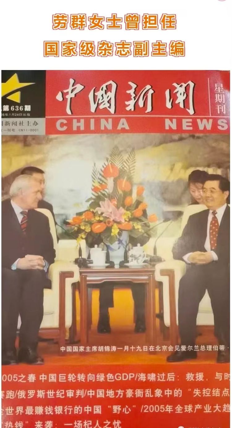 劳群女士还曾任中国新闻社《投资中国》杂志执行主编;并曾任:中新社浙江分社的社委会委员、监察室监察委员分管记者和行政纪律、并分管《中国新闻周刊》浙江办事处、曾任:新华社新华出版社《人居》杂志浙江版副主编,中央人民广播电台第二套节目杭州调频fm97.9节目监制;参加省部级新闻发言人高级培训班并具备浙江省首届省级新闻发言人任职资格、曾任:杭州市委宣传部与中国新闻社联合主办的“杭州市对外宣传基地”办主任、杭州国际交流中心副主任等专业学术职务。