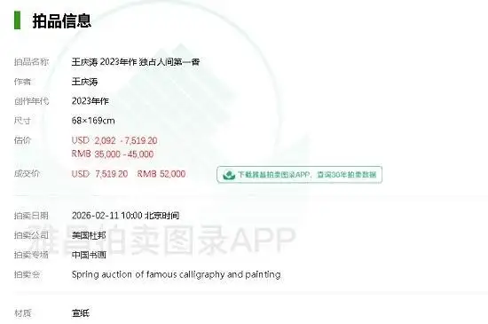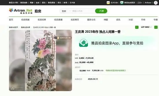 2026年2月11日,美国杜邦中国书画拍卖会现场传来捷报——著名艺术家王庆涛老师的《独占人间第一香》经过多轮激烈竞价,最终以52000元人民币落槌,引起了收藏界和艺术爱好者的广泛关注。这些凝聚着艺术家心血与才华的墨宝,在拍卖会上竞相争艳,展现出中国书画艺术的永恒魅力。业内人士指出,此成交价不仅印证传统书画在当代艺术市场的强劲生命力,更标志着中国字画收藏进入笔墨精神与投资价值并重的新阶段。
