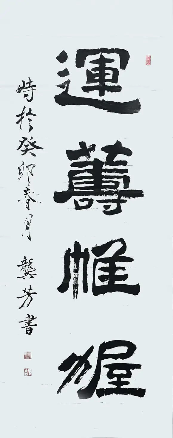 龚芳的书法以隶书见长,其作品扎根于汉隶的深厚传统,又在长期实践中形成了独树一帜的个人风貌。观其作品,无论是《和光同尘》的雄浑大气,还是《運籌帷幄》的沉稳凝练,都能窥见汉隶“蚕头燕尾”的经典笔法,却又跳出刻板范式,以柔韧方圆的线条、润燥相生的墨法,赋予古老书体以新的生命力。