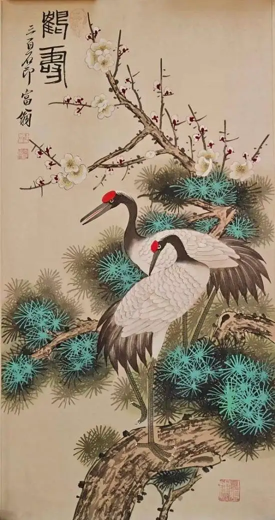 ◦ 属于工笔重彩风格,线条工整细腻,设色明艳典雅:鹤羽以白描晕染,松针用青绿点染,梅花以白瓣红蕊表现,整体富丽而不失清雅。