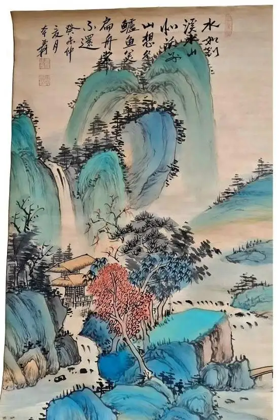 ◦ 青绿设色:以石青、石绿、赭石等矿物颜料晕染山石,色彩明丽典雅,继承了宋元小青绿山水的传统,又融入了近代文人画的写意性。