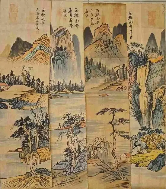 ◦ 四条屏各自独立成景,又可拼接为完整山水长卷:从左至右依次展现山居、飞瀑、平湖、危崖,营造出“咫尺千里”的深远意境。