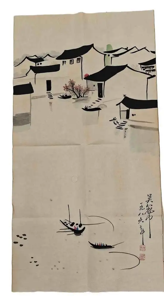 ◦ 笔墨表现:以浓墨勾勒白墙黑瓦的轮廓,线条简洁流畅,极具现代感;以淡墨晕染水面与远山,营造出朦胧空灵的水乡氛围;前景的船只与人物以极简色块点染,生动传神。