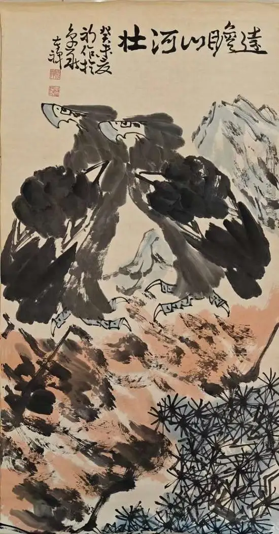 ◦ 构图布局:双鹰并立,主次分明,鹰身占据画面主体,留白与山石、松针形成疏密对比,整体气势雄浑,极具视觉冲击力。