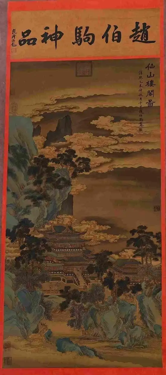 1.属于界画山水(工整的建筑绘画与写意山水结合)。画面描绘了云雾缭绕的仙山之中,楼阁亭台错落有致,整体呈现出“咫尺千里”的深远意境。