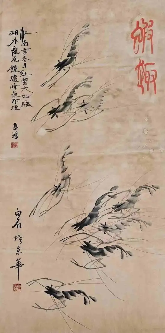 ◦ 构图布局:群虾错落分布,疏密有致,虾须相互交织却不杂乱,营造出“水中嬉戏”的动态感,留白处更显水意空灵。