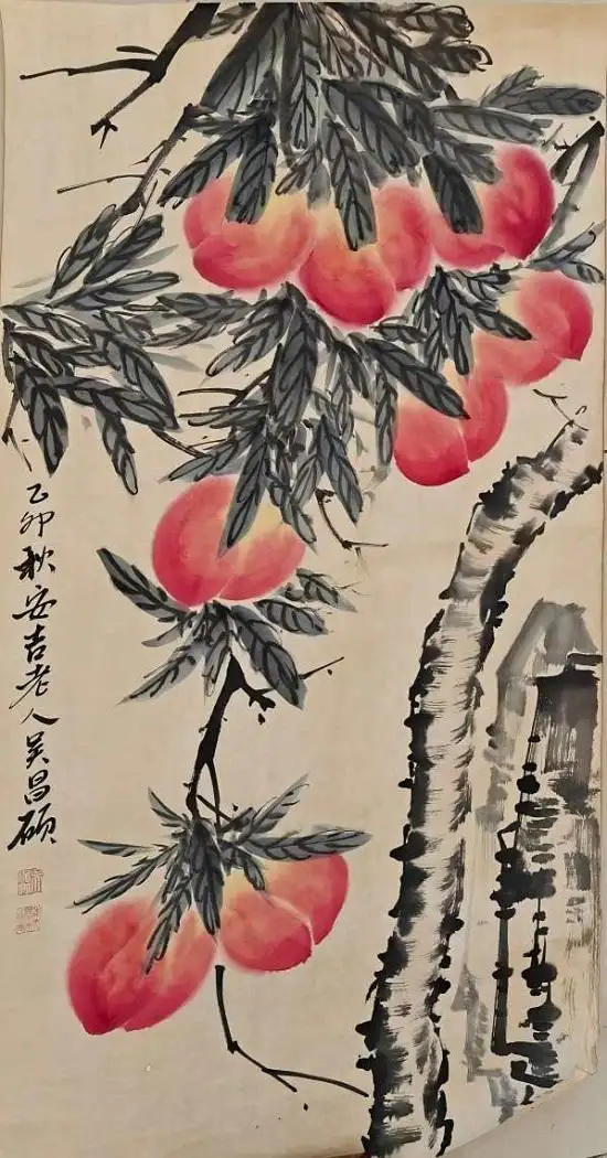 ◦ 桃枝与墨叶:以浓墨大写意笔法写出,苍劲老辣,与艳红的寿桃形成强烈对比,体现“刚柔并济”的审美。
