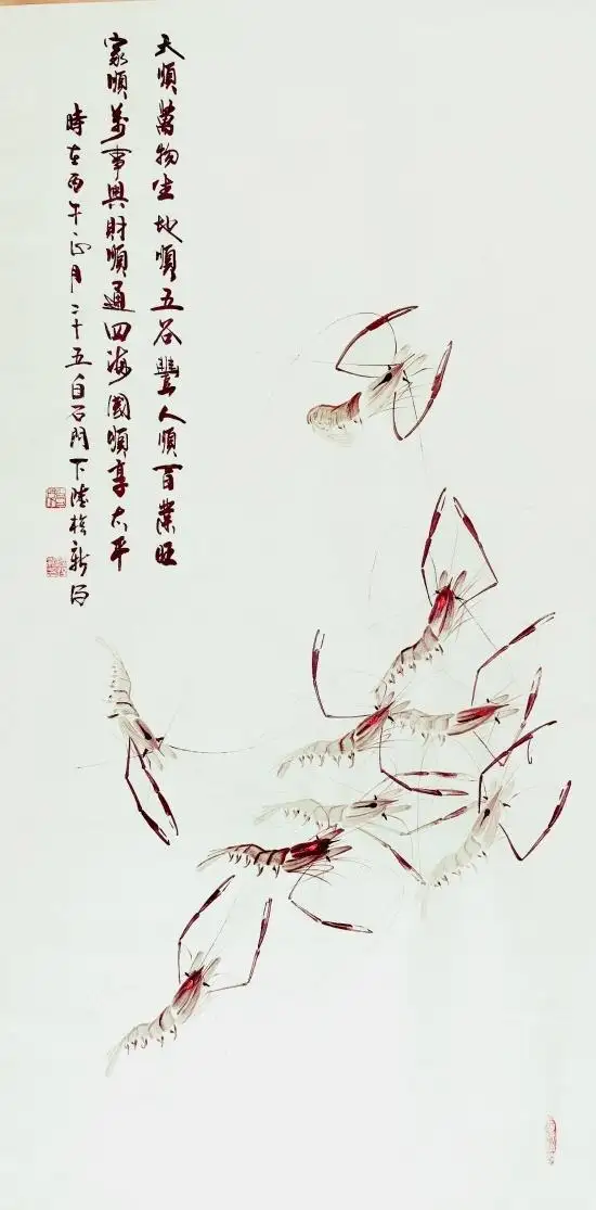 《六六大顺》是陆梓新会意水墨画的经典之作,以白石画派画虾技法为根基,寥寥数笔便勾勒出六只灵动鲜活的虾,姿态各异、栩栩如生,或悠然游弋,或相互嬉戏,笔墨简练却神韵十足。画面左侧配以清雅题字,笔墨与文字相得益彰,既蕴含着“六六大顺”的美好寓意,承载着对生活顺遂、国泰民安的真挚祝福,又彰显了中华传统书画“诗书画印”一体的独特美学。陆梓新在创作中,将白石老人“妙在似与不似之间”的艺术理念融入其中,以极简的笔墨勾勒出虾的通透质感与灵动神韵,每一笔都饱含匠心,每一处细节都尽显功力,让观者在笔墨流转间,感受到东方水墨的空灵意境与生命活力。