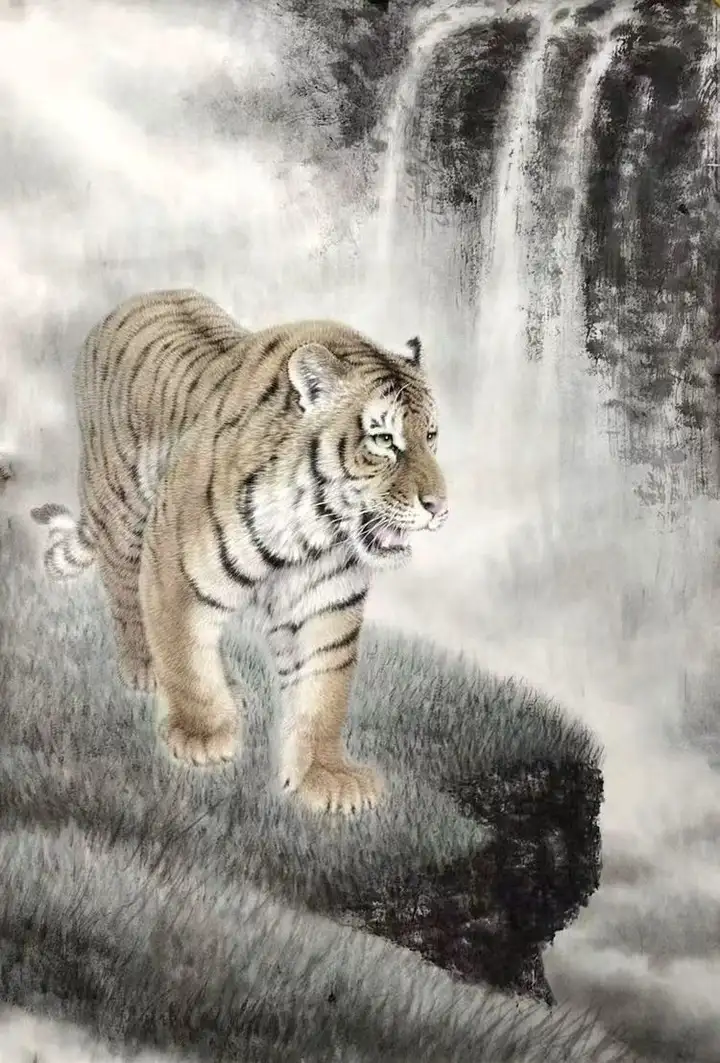 《山君听瀑》 尺寸:68cmX69cm 创作时间:2023年
