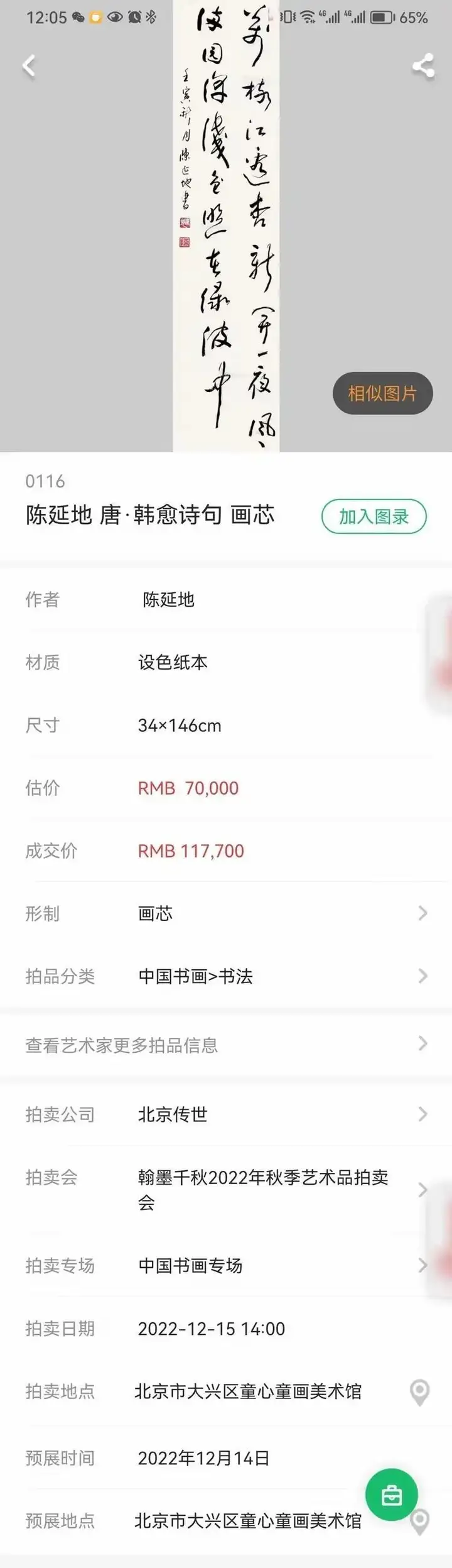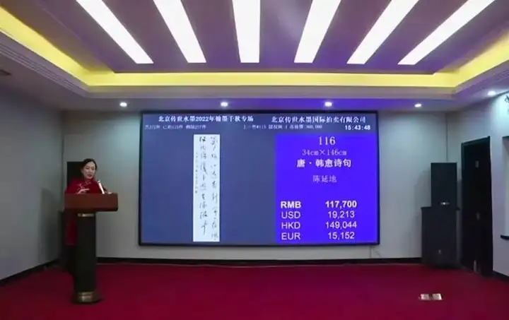 北京传世拍卖有限公司在2022年12月15日举行的中国书画拍卖专场中,此前备受关注的陈延地作品《春游曲》经过轮番激烈竞争,最后以11.77万元人民币成交,完美落锤。从陈延地拍卖现场实况来看,我们对陈延地的书法作品的艺术价值有了更进一步的认知,其艺术前景与市场价值不可估量。