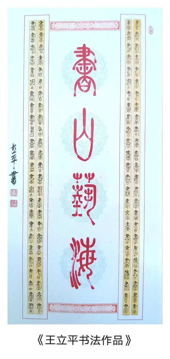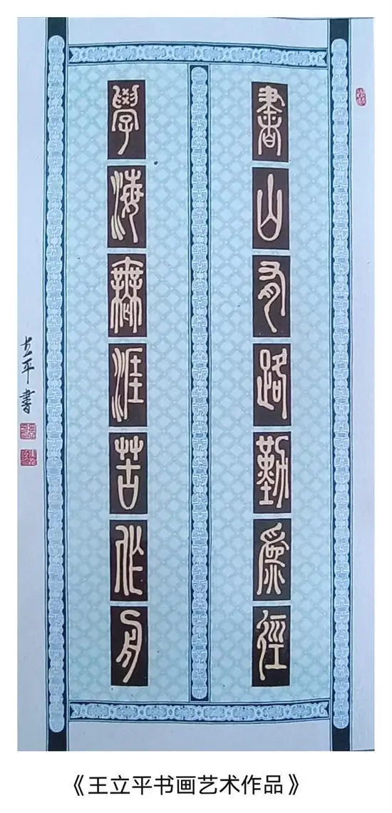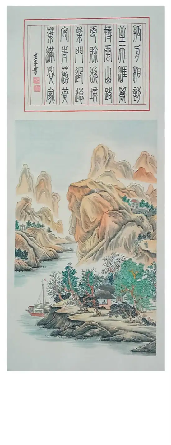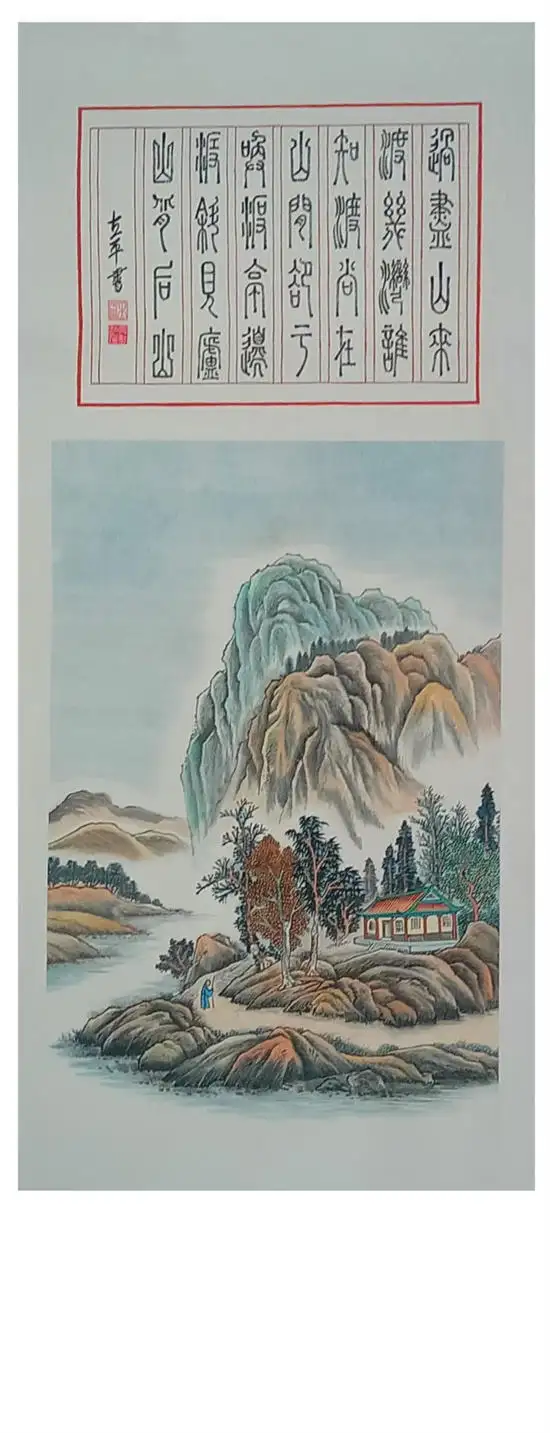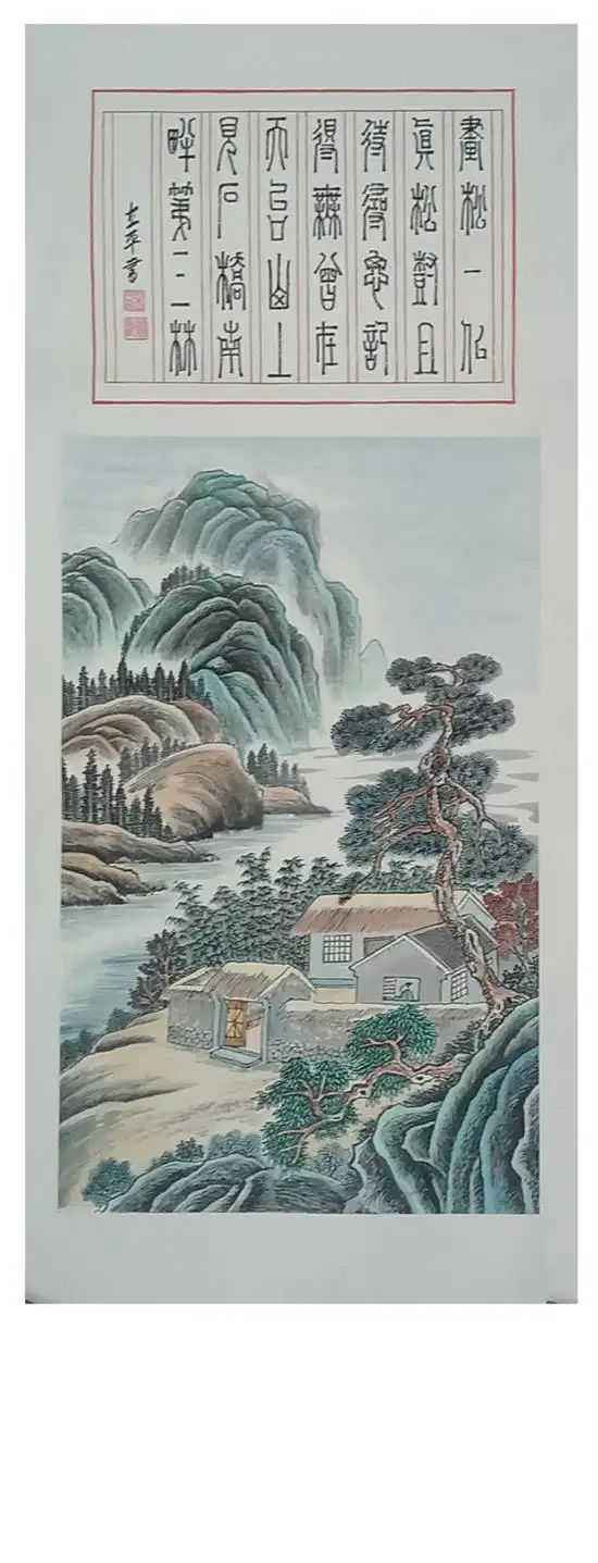 王立平老师深耕书画艺术数十载,始终坚守 “书画同源” 的文人传统,在山水创作与书法篆刻领域均造诣深厚。此次赠予尼日利亚大使馆的作品,是其艺术风格的集中体现:画面上方,篆隶书法笔力雄健、结体古雅,字字苍劲有力、气韵贯通,尽显中华文字的千年文脉与金石风骨;下方山水,以工写结合的技法绘就峰峦叠翠、松风泉鸣的盛景,山石勾勒精准,设色温润雅致,屋舍掩映林间,尽显东方山水的空灵意境与人文情怀,实现了书法与绘画的完美交融,将中国传统文人画的雅致风骨展现得淋漓尽致。