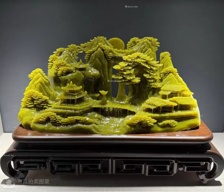 这件作品的玉料堪称岫玉上品:整体呈匀净的黄绿色,质地温润细腻,光泽内敛柔和,透明度恰到好处,既保留玉石厚重质感,又让雕刻细节层次分明。玉料天然色泽与山水题材完美契合,仿佛天地间的青山绿水本就蕴藏于玉石之中,等待匠人以刀为笔唤醒,尽显“天人合一”的中式美学追求。