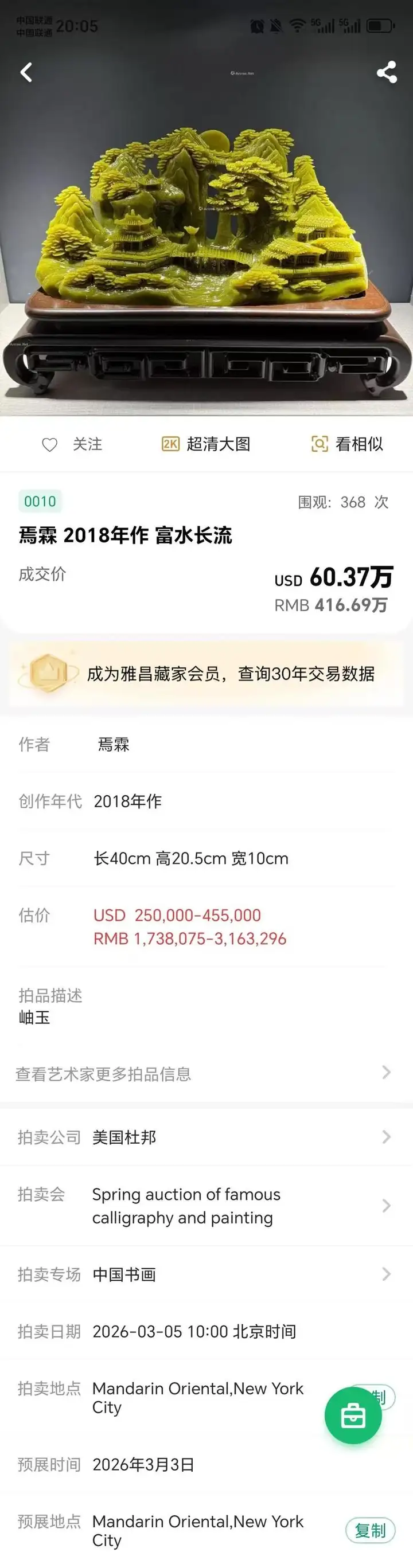 2026年3月,纽约曼哈顿文华东方酒店的拍卖场上,玉雕艺术家焉霖2018年创作的岫玉山子《富水长流》以60.37万美元(约合人民币416.69万元)落槌,惊艳国际藏界。这件长40cm、高20.5cm、宽10cm的作品,以温润岫玉为载体,将中华山水灵秀与人文雅致凝于方寸,既是当代玉雕山子工艺的典范,更承载着中国玉文化跨越万年的精神传承。
