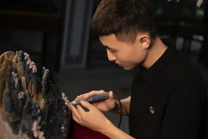技法运用上,焉霖将传统玉雕与现代审美巧妙结合:以深雕突出山体厚重,以透雕营造空间通透,以浅刻勾勒细节精致,以圆雕塑造整体立体。尤其是对“水”的刻画堪称神来之笔,以阴刻线拉出水流脉络,利用玉料天然光泽表现流水灵动,仿佛能听到溪水潺潺声响,真正做到“虽由人作,宛自天开”。