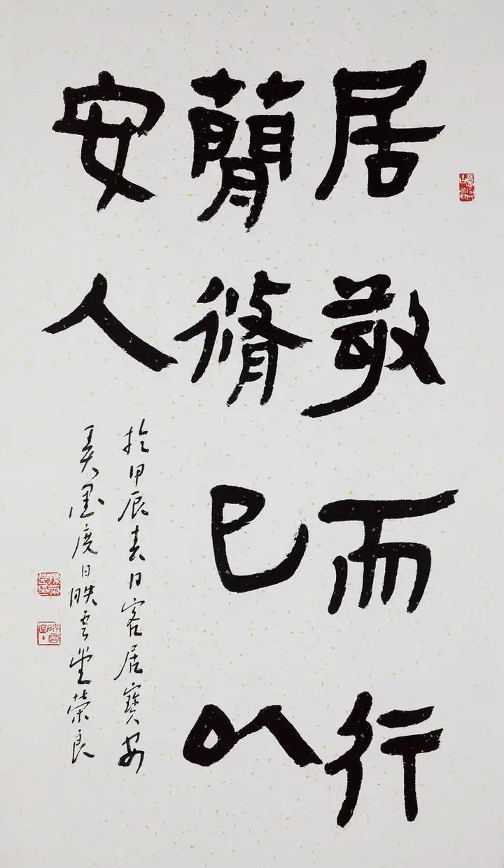 孙荣良老师作品章法布局舒展大气:六字横向排布,字距疏朗开阔,左右落款与印章的位置恰到好处,既不抢主体字的风头,又平衡了画面,让整幅作品在古拙中透着灵动,庄重里藏着喜庆,是甲骨文吉语创作的上乘之作。