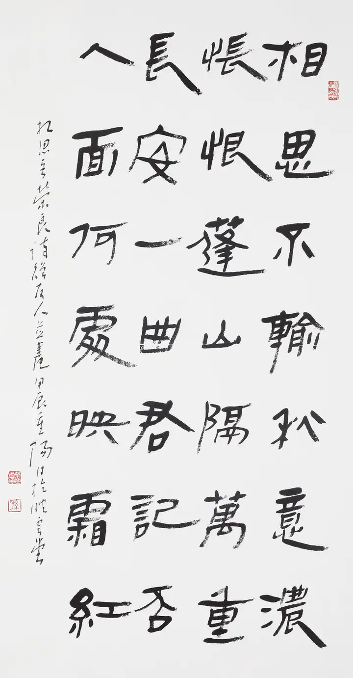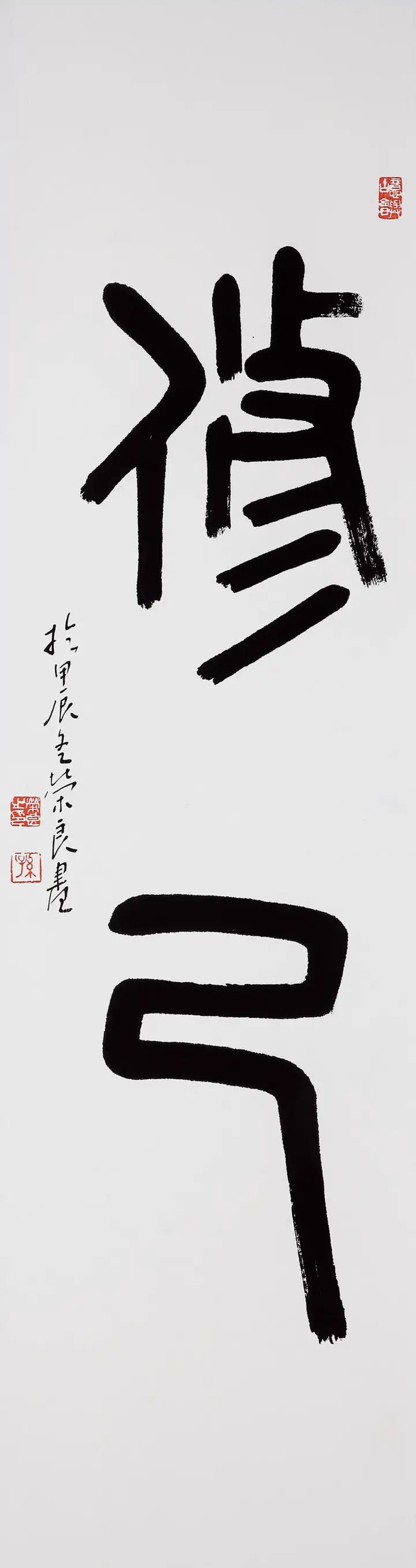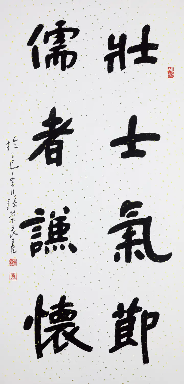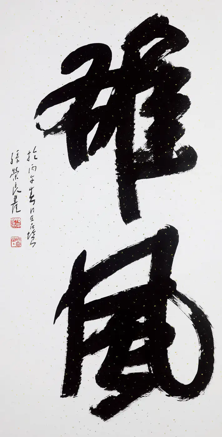 孙荣良先生字沉稳厚重,一收一放、一轻一重,形成了完美的视觉平衡。左侧落款小字灵动秀逸,与主体大字形成大小、粗细的对比,印章的钤印位置精准,让整幅作品气韵贯通、浑然一体,“长寿”的祈福寓意也通过厚重的笔墨传递得淋漓尽致。