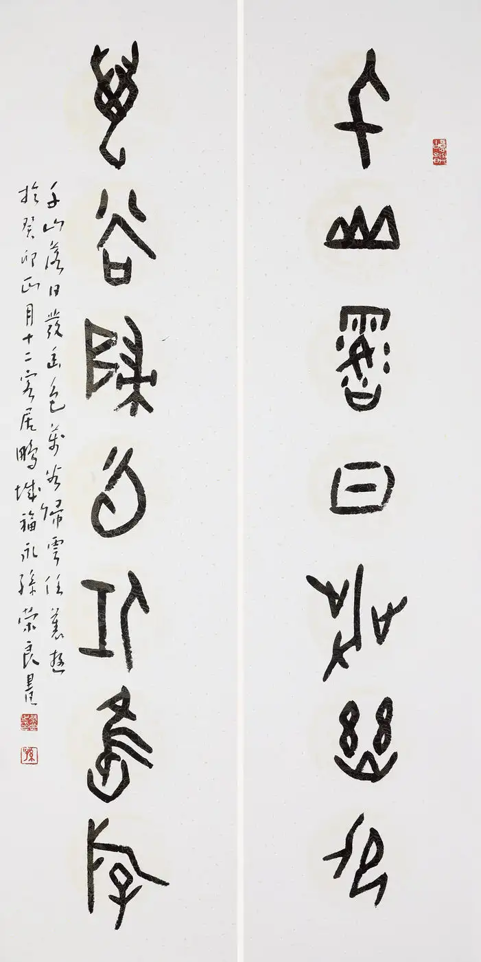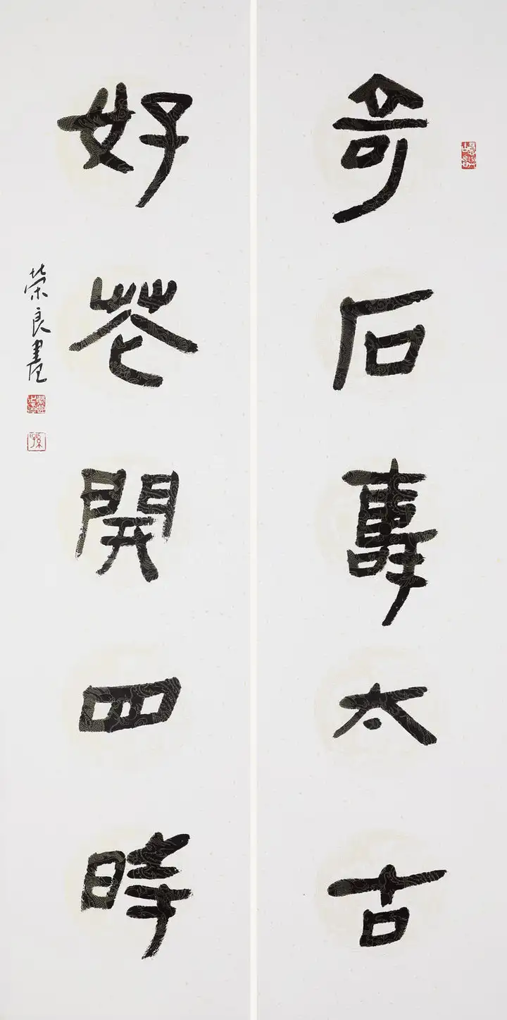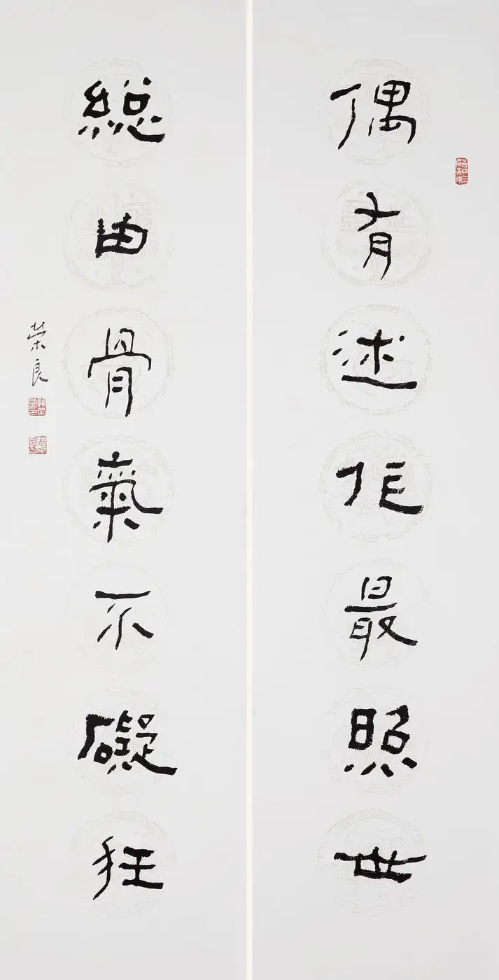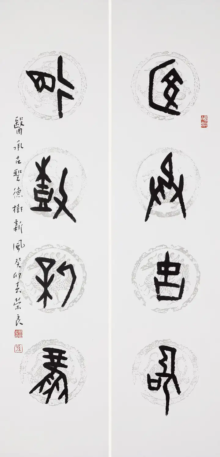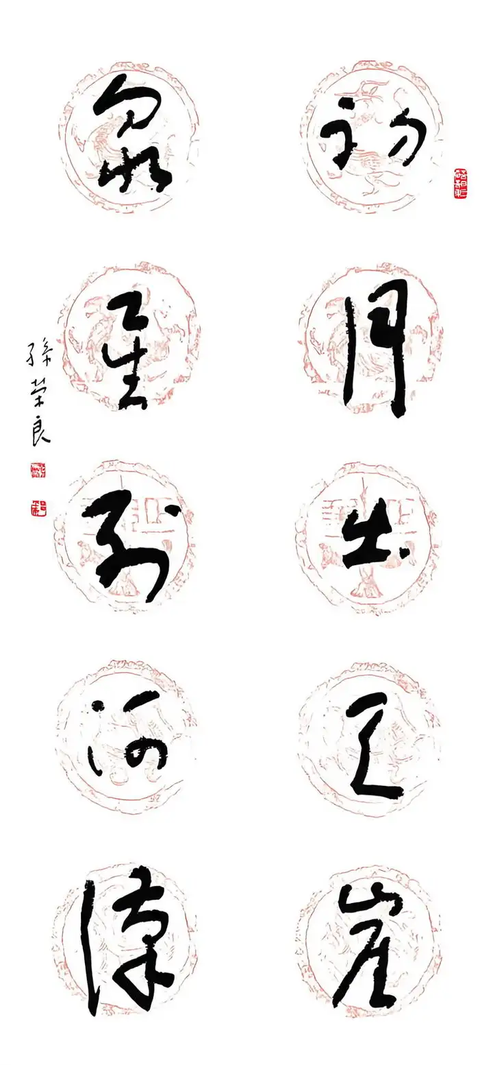 孙荣良先生作品笔法苍劲老辣,金石气足:用笔以中锋为主,线条圆厚饱满、力透纸背,起收笔藏露结合,提按顿挫间尽显笔力。线条的粗细变化自然灵动,既有篆书的圆劲,又融入了隶书的波磔意趣,让静态的篆书有了动态的韵律感,金石气扑面而来。