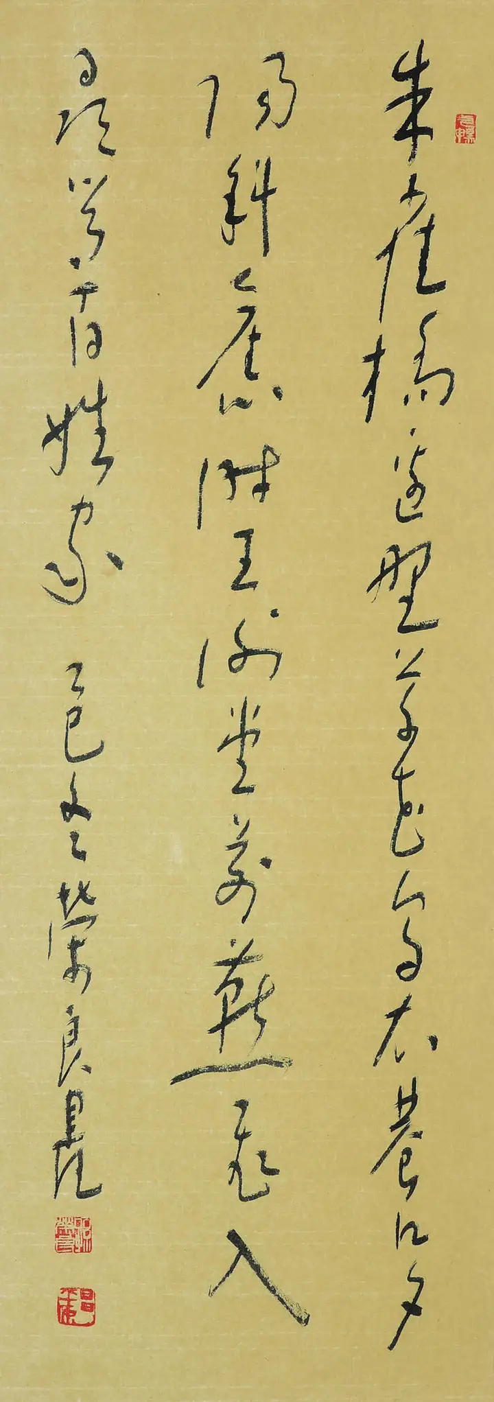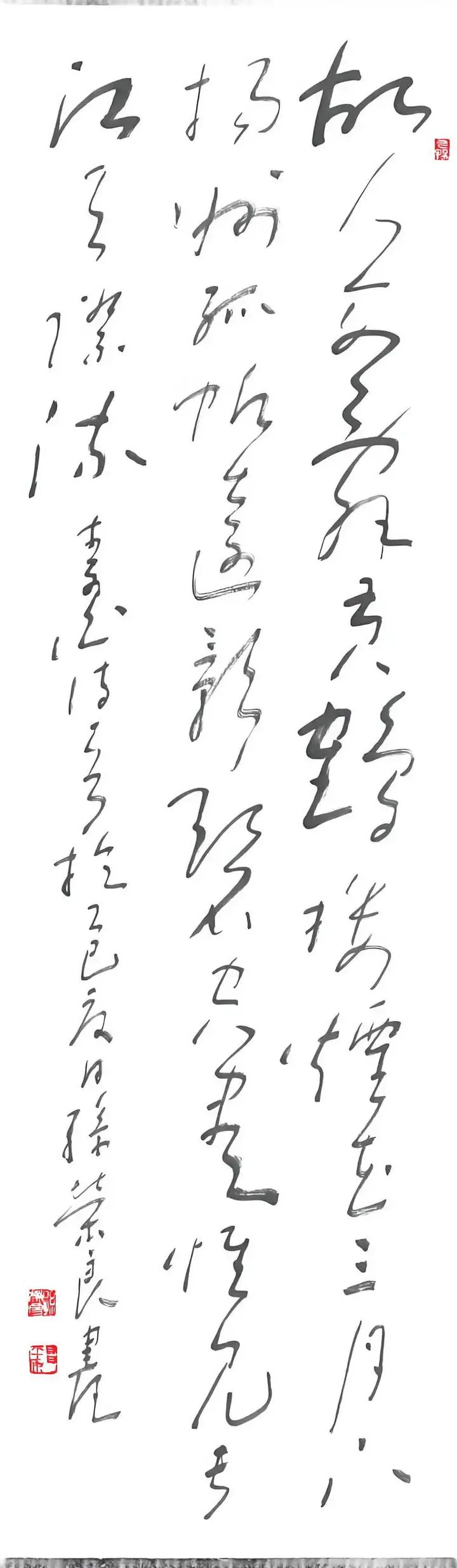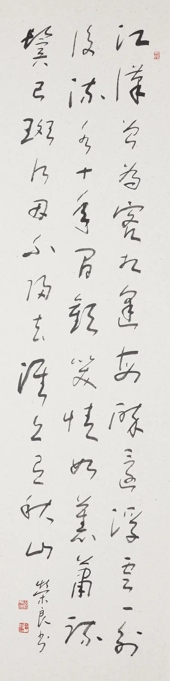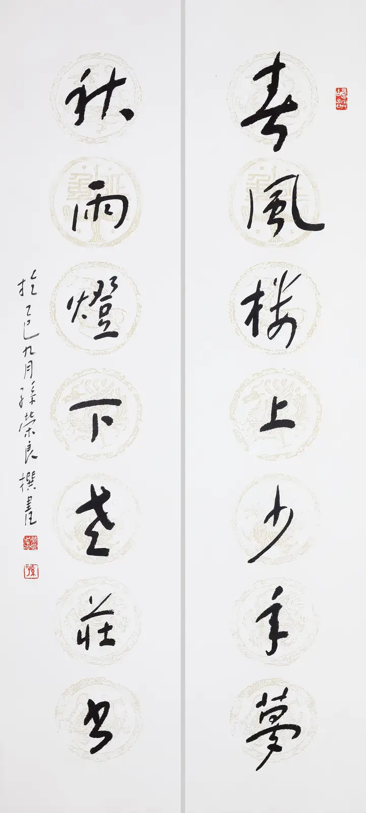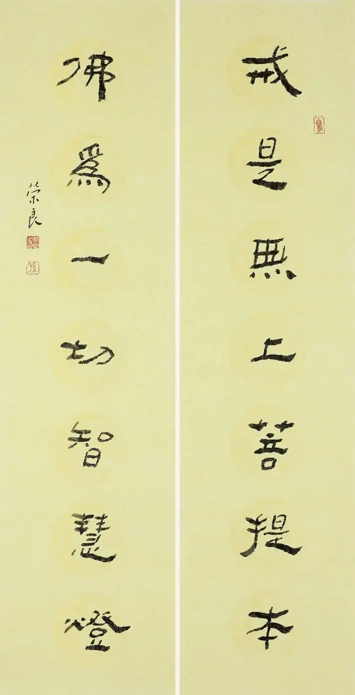 孙荣良先生作品笔法苍劲老辣,金石气足:用笔以中锋为主,线条圆厚饱满、力透纸背,起收笔藏露结合,提按顿挫间尽显笔力。线条的粗细变化自然灵动,既有篆书的圆劲,又融入了隶书的波磔意趣,让静态的篆书有了动态的韵律感,金石气扑面而来。