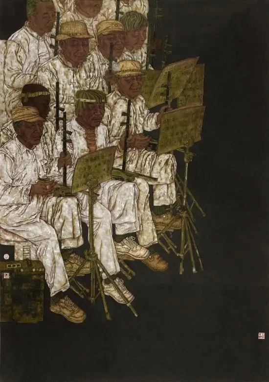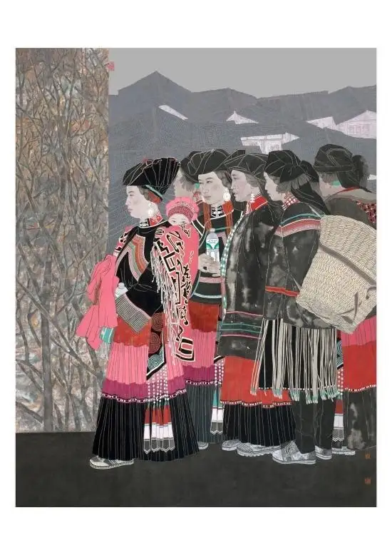 在工笔重彩人物领域,王贞同样展现出卓越的创作能力。其作品《乐土》等,以民族群像为创作题材,造型严谨、色彩厚重,兼具时代性与人文关怀,获得第二届“江海门户通天下”全国中国画作品展入会资格,成为其工笔人物创作的代表作。