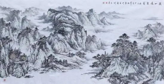 代表作品《云水间》《江南之韵》《梦回家山》等,充分展现了其山水创作的独特风格。在《云水间》中,王贞以大面积淡墨渲染云雾的形态,墨色晕染自然流畅,虚实相生间营造出“空山不见人,但闻人语响”的空灵意境;焦墨线条勾勒山石轮廓,线条刚劲有力,与柔和的墨色形成鲜明对比,赋予画面沉稳的骨架。整幅作品没有过多的细节堆砌,却通过笔墨的浓淡变化、线条的粗细交错,传递出山水的雄浑与灵动,让观者仿佛置身于云雾缭绕的山水之间,感受自然的静谧与辽阔。