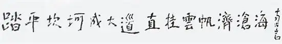 南海岩,一位当今画坛不可多得的实力派画家。他的重彩人物画作品真实且厚重,大气而创新。殊不知,其书法亦然,亦有着令人赞口不绝、可圈可点的地方。他的书法,用笔稳健,结体磊落,,法完美。于自然中见拙朴,于流畅中显飘逸,于收放中写性情。气韵弥满,格调高雅。与此同时,徜徉在他的书法作品里,你会强烈地感受到作为山东汉子所特有的真诚直爽、外粗内秀之品质。其作品里的不做作,不妖媚,不流俗,且点画交代十分清晰、字字保持顾盼独立,恰恰表现了作者难能可贵的高尚情操与魅力人格。因此,他的书法多了份丈夫气,有阳刚之美,多了份金石味,有端庄之态,多了份帝王相,有威严之意。