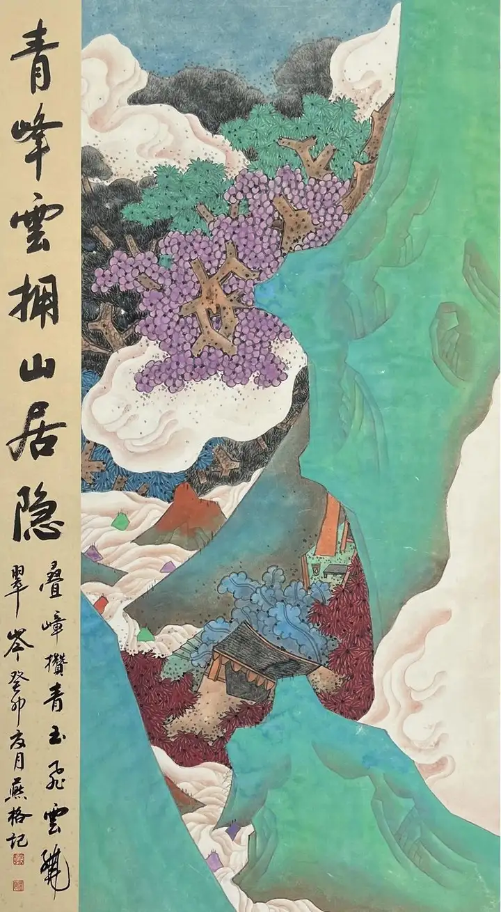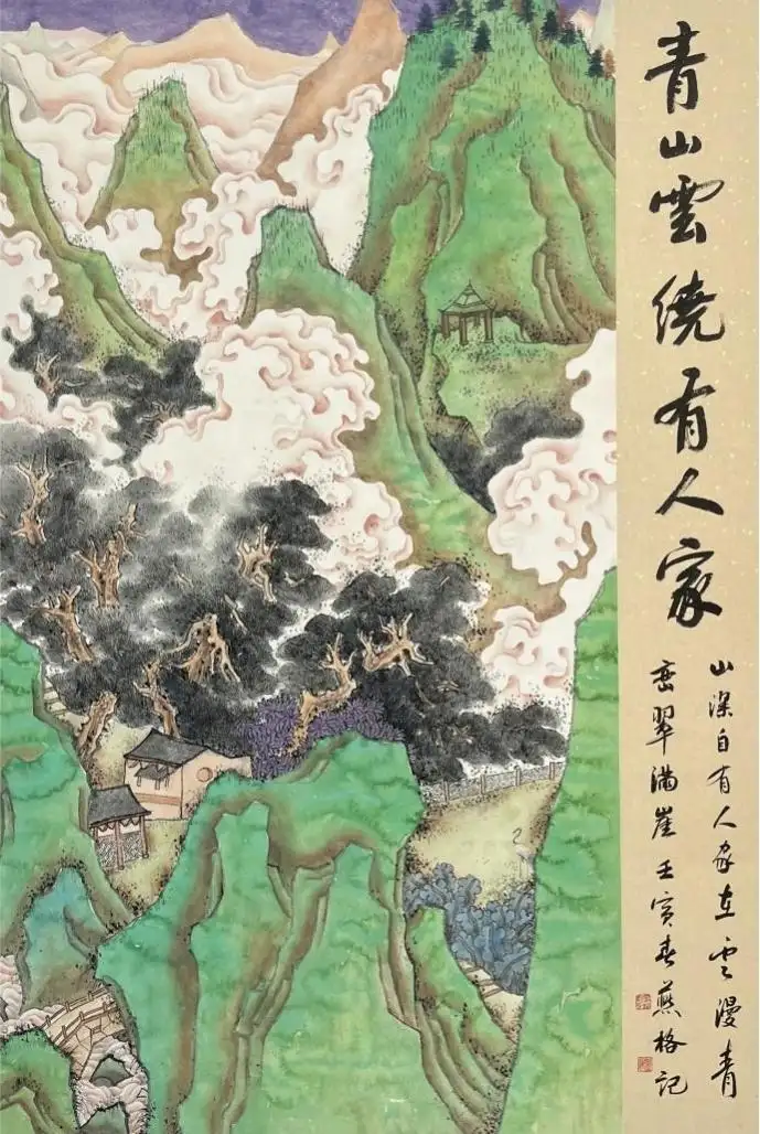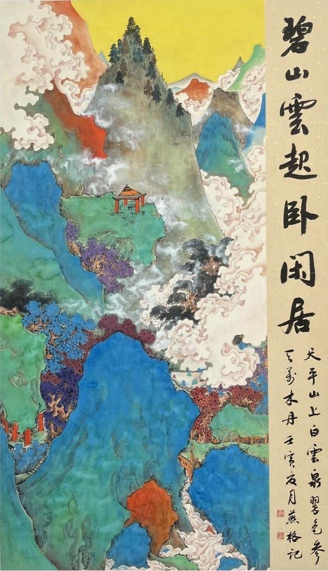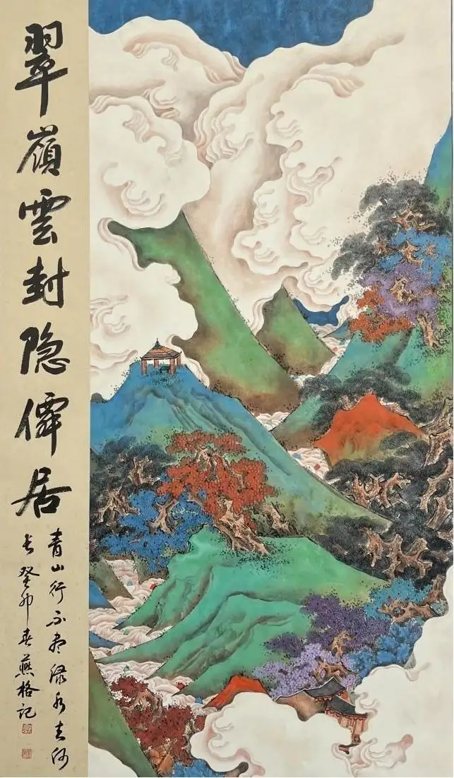 她以古意工笔为根基,深研唐宋青绿山水的笔墨精髓,将传统大青绿、金碧山水的技法融入当代创作。《翠岭云封隐仙居》《碧山云起卧闲居》《青山云绕有人家》三幅作品,以浓艳而不俗的石青、石绿、朱砂铺就山川,以行云流水的线条勾勒云气,既复刻了古画的雄浑意境,又融入现代审美,实现了古今技法与审美的完美融合。