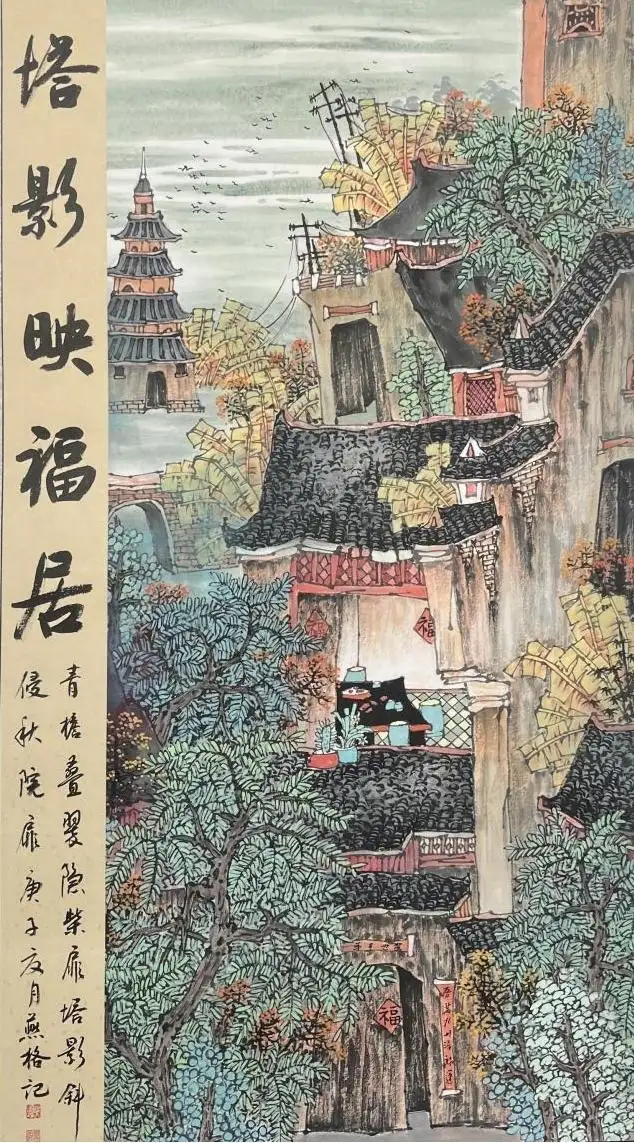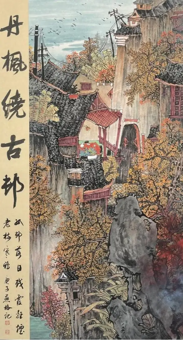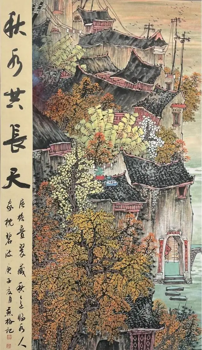 秦燕格老师的写生,是“真功夫”的极致展现。她摒弃闭门造车的创作模式,深入村落实地写生,精准捕老实建筑的细节、秋林的色彩层次、水乡的灵动气韵,让每一幅作品都充满现场感与生命力。同时,她以工笔山水的极致技法,对画面进行深度打磨:线条刚劲有力,精准勾勒建筑肌理;色彩层次丰富,晕染出村落的秋意与温度;构图开合有度,将村落的错落之美与山水的悠远意境完美融合,实现了写生的“真”与工笔的“精”的完美统一,尽显其专业高度与艺术造诣。