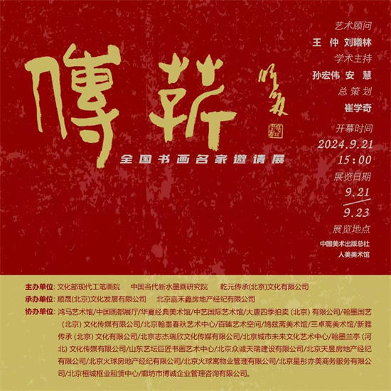 9月21日,由现代工笔画院、中国当代新水墨画研究院、乾元传承(北京)文化有限公司共同主办,顺晟(北京)文化发展有限公司、北京嘉禾鑫房地产经纪有限公司承办的“传薪·全国书画名家邀请展”在中国美术出版总社人美美术馆开幕。著名书法家何仲琪受邀参加本次展览。