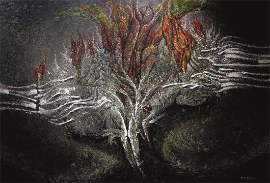 目视谭钧,我想到了海德格尔对艺术追问海德格尔提出的第一个问题:作品是什么,它如何成其为作品。他的回答是作品是自然现存的东西,与物的自然现存并无二致(我认为这是面对欧洲传统的写实绘画而言)他认为,所有艺术作品都具有这种物因素。如果如此,谭钧的所谓女人体,墨戏的灌木树支亦然?海德格尔又追问,它们没有这种物性因素会成为什么呢?回答是,我们却必须把艺术作品作为人们体验和欣赏的东西。我的回答是只有意淫、记忆和实践活动了,海德格尔接着提到了色彩、音乐中的声响,他说物因素在艺术作品中稳固,就如同我在谭钧画室中看到的那些亚麻布画框,堆积涂抹的油画颜料,被褶皱的宣纸,这些都是所谓“物”因素。但是,海德格尔追问,在艺术作品中这种不言自明的物因素究竟是什么呢?他以为艺术作品远不是物因素,它还是某种别的什么。这种别的什么就是艺术成为其艺术的东西。在场,谭钧的工作室就具有一种“在场”的感觉。我经常说那是存在的痕迹。这就是沉浸于物的在场,与物的直接遭遇,在视觉、可听觉和触觉中,感知的东西。这就是我在谭钧工作室刹那间的感觉。总而言之,谭钧在墨戏和油画之间矛盾冲突统一,这是一种内心独白。