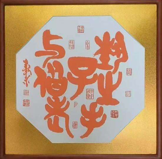 2025年7月15日香港康乾拍卖的拍场中,一幅2025年书法新作拍出99万元最高价,作品为《执子之手与子偕老》仅八个字,确切地说是七个字。此幅书法作品中(子)字居中,上下句同借,别出心裁使用朱砂彩墨,裁用八边型、并裱卡纸装框,其强烈喜庆装饰效果与书法内容匹合。