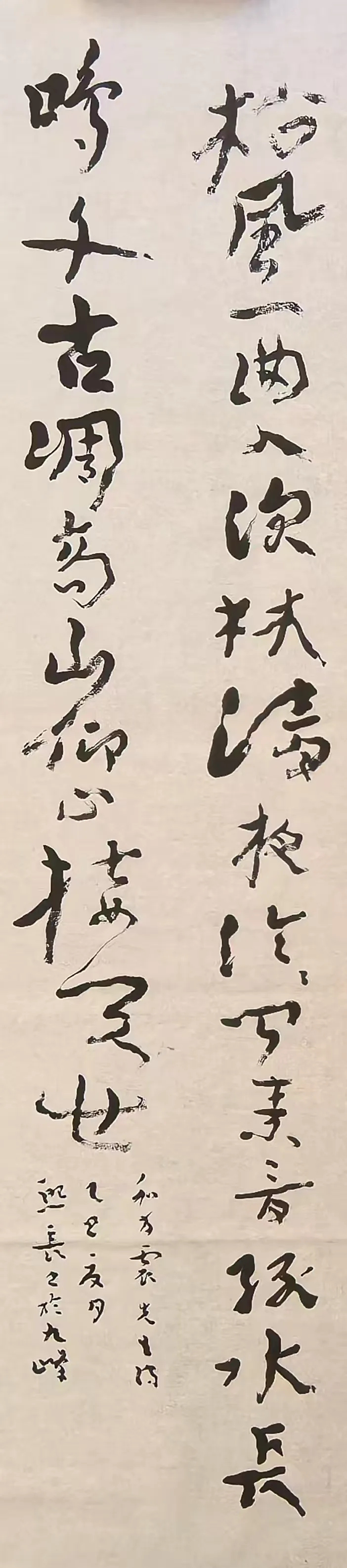 金师篆籀笔法理论之核心,在于对“金石器”七重境界的深刻体悟与精妙化现。如题图诗作,其笔下书法,绝非仅止于字形结构的平面经营,而是将柔毫淬炼为刻刀,令宣纸化作钟鼎碑石——每一次提按顿挫,皆是心力的“敲击”,于无声处“撞击”出斑驳淋漓、震人心魄的“金石感”。他善驭长锋羊毫,行笔以中锋为主,笔力千钧,如锥画沙,力透纸背,似有凿石铸铜之铿锵蕴于其间。墨色经营更是匠心独运,超脱均匀流滑之窠臼,刻意追求自然洇化与飞白之趣:浓重处如青铜锈蚀般层叠堆积,似熔铜浇铸时的凝重凝固之声;枯笔处似金属历经千年风雨剥蚀般苍茫,仿佛能听闻霜蚀冰泮、岁月剥落的簌簌微响。那些看似不经意的“破锋”、“飞白”,绝非技艺疏漏,实乃先生刻意为之的“天籁留痕”,旨在令宣纸之上重现青铜铭文历经千载风霜后特有的斑驳肌理、厚重质感与苍古意韵,并唤醒潜藏其间的历史回声。文中所举“西”字之峻拔如斧凿、“雲”字之舒卷含氤氲、“也壬辰”之古拙藏机趣、“鹤寿”之雍容蕴沧桑,正是此般“可视可听”之境界的淋漓展现。