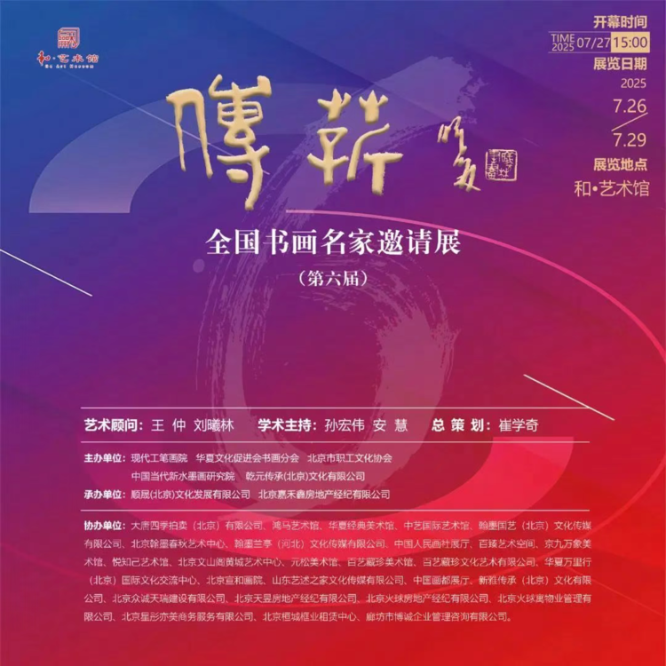 2025年7月27日,由现代工笔画院、华夏文化促进会书画分会、北京市职工文化协会、中国当代新水墨画研究院、乾元传承(北京)文化有限公司共同主办,顺晟(北京)文化发展有限公司、北京嘉禾鑫房地产经纪有限公司承办的“传薪·全国书画名家邀请展(第六届)”,在和·艺术馆隆重开幕。中国国家博物馆馆员、华夏文化促进会副会长兼书画分会执行会长张金卫主持开幕式。