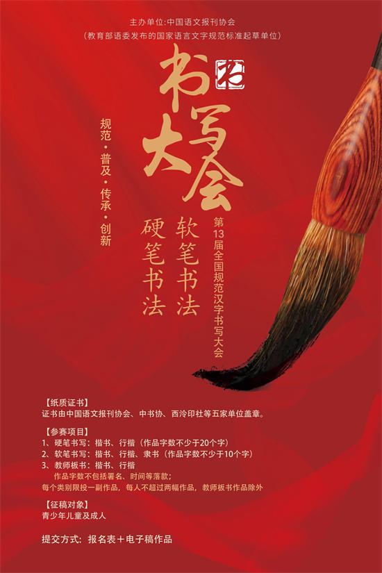 为贯彻落实中共中央办公厅,国务院办公厅《关于实施中华优秀传统文化传承发展工程的意见》和教育部关于加强规范汉字书写,传承中华优秀传统文化,开展书法教育的要求。由中国语文报刊协会、西泠印社出版社、中国书法家协会展览部等单位联合主办的大型国家级赛事,第十三届全国规范汉字书写大会活动。