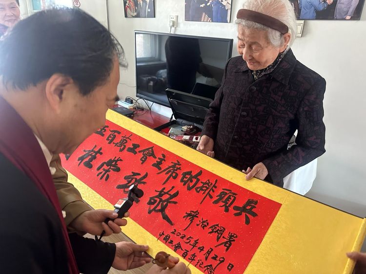 致敬现场,一场别开生面的“文化接力”温情上演:全国劳模詹百华、张春成化身“抻纸人”,为穆治钢悬纸书法抻纸;全国五一劳动奖章获得者陆军端墨,穆治钢笔走龙蛇,“向中国五百万工会主席的排头兵刘桂荣致敬”行楷作品一气呵成,现场创作的金色“福寿”大字更添祥瑞。