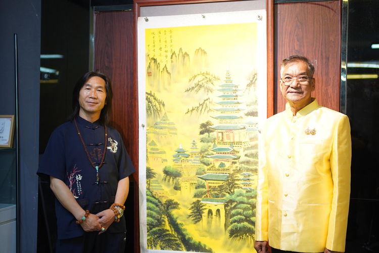 2025年鸿鹄艺术馆冯馆长带领其艺术馆里二十多名艺术家受邀参加了此次中泰建交50周年高级交流晚宴活动,著名画家李元年老师也参加了这次交流晚宴,并与泰国政要及素博·巴莫亲王现场合影,作品被其亲王收藏。