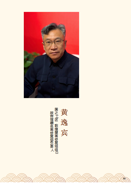 黄逸宾 ,1968年出生于浙江余杭 ,擅长精工笔法 。中国著名文物修复专家 、岩 彩画家 、艺术教育家 ,国家级非物质文化遗产项目“岩彩绘画技艺 ”代表性传 承人 ,“九大功勋艺术家 ”之一 。现任敦煌研究院壁画修复组组长 、故宫博物 院馆藏名画修复技术总顾问 。因其在中国古代壁画与书画修复保护以及传统岩 彩绘画传承与创新方面的卓越贡献 ,被誉为“ 国宝守护者 ”与“ 中国壁画最后 的匠人 ”。