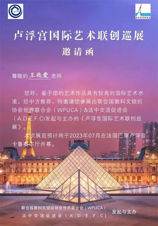 2023年法国时间7月15日,由联合国教科文组织协会世界联合会(WFUCA)和法中交流促进会(A.D.E.F.C.)联合主办的“2023国际艺术联创联展”在法国卢浮宫卡鲁赛尔厅盛大开幕。联合国教科文组织协会世界联合会代表罗伯特•福帕(Robert FOPA)、中国驻法国大使卢沙野、法国最高荣誉骑士勋章获得者、作家、翻译家、法中交流促进会主席亚丁、国际旅游联合会主席让-埃里克•德•圣卢克(Jean-Éric de Saint Luc)、历届法国小姐等上千位国际政界、商界、文化艺术界、科技界、娱乐界等不同领域的嘉宾出席开幕式,共同见证这一重要时刻,参与这场神奇的艺术盛宴。