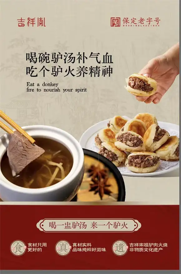 在宋祖火烧店,可以吃到馋人的非遗驴肉火烧和小驴哒哒火烧,玲珑小火烧,百年非遗驴肉糕,喝到放了黄芪党参等二十多味中药调料慢火熬炖9小时的鲜甜驴肉汤,一口爆汁的鲜驴肉馅饺子和西式果木炙烤驴肉火烧...