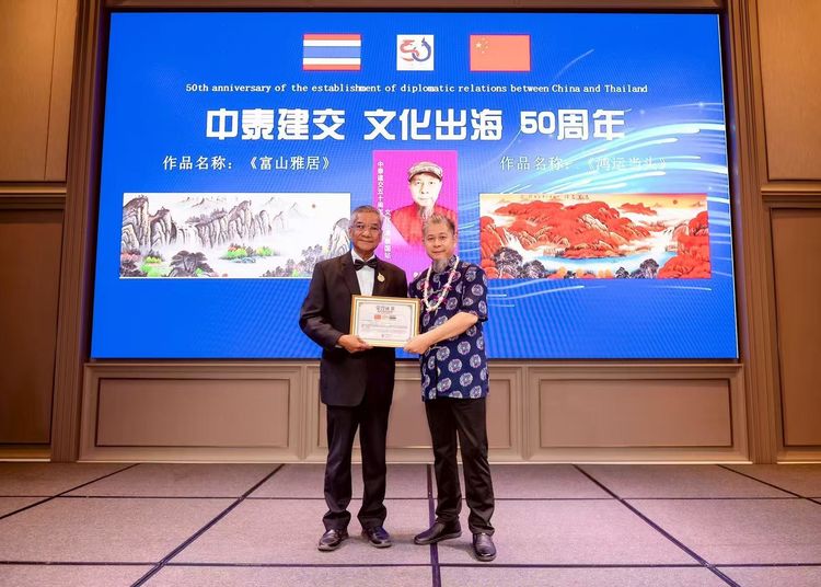 中泰建交半个世纪以来始终相互尊重、真诚相待,五十年风雨同舟彰显两国真挚情谊。平等合作、互利共赢成就双方各领域合作丰硕成果,惠及民众。两国在国际事务中保持良好协调配合,共同推进区域经济一体化和安全执法合作。坚信两国将继续共创更美好未来。文化产业书画行业为中泰关系发展给泰国带来机遇,加深了两国之间的往来与密切合作,未来将共同开启更加繁荣的“书画艺术”之路。2025年鸿鹄艺术馆冯馆长带领其艺术馆里二十多